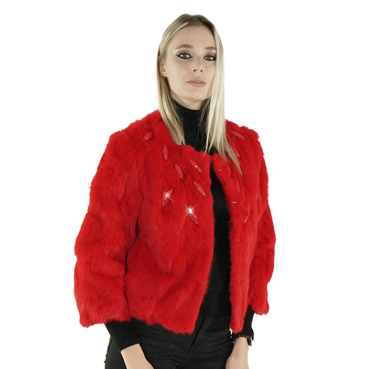 Red Real Rabbit Fur Jacket With Stones "Deenie"
