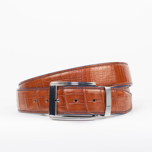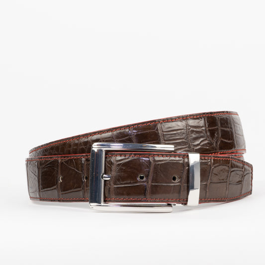 Discover our collection of crocodile belts featuring contrasting colors. Each belt is crafted from the finest crocodile skins, showcasing the unique texture and pattern of the material. The bold stitching in a contrasting color creates a stunning visual effect, adding a touch of sophistication to any outfit.