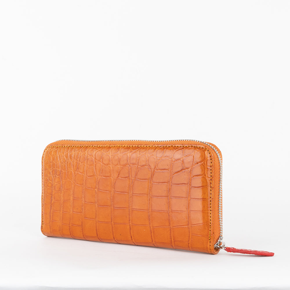 Because your fall wardrobe deserves a wallet to match, we bring you this genuine crocodile wallet tanned in a delicious dark orange. Elegant and sophisticated enough for a night at the savoy, yet colorful and fun perfect for a day out with your girlfriends.